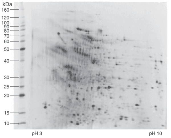 2D Western blotting is the current gold standard procedure for determining HCP coverage for biopharmaceutical product approval. It combines total protein detection with the use of specific HCP antibodies in high-resolution imaging. 2D Western blots can also be used to visualize post-translational protein modifications such as phosphorylation using anti-phospho antibodies.